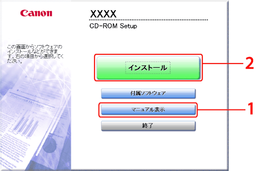 「ファクスドライバーインストールガイド」を参照するとき、最初にクリックします。インストール開始後は、インストールガイドを表示できません。