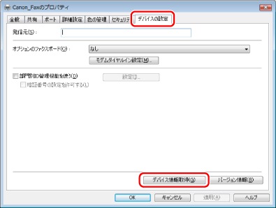 ファクスを共有してお使いの場合は、プリントサーバーに「Canon Driver Information Assist Service」をインストールすると、[デバイス情報取得]の機能をお使いになれます。「Canon Driver Information Assist Service」のインストール方法については、「ファクスドライバー インストールガイド」を参照してください。