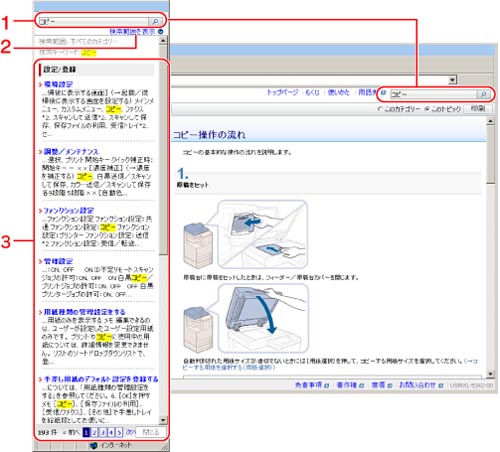 「トップページ」や「トピックページ」の右上にある入力欄に文字を入力して、 をクリックすると、検索ダイアログボックスが表示されます。表示されたダイアログボックスに文字を入力しても検索を行えます。 また、e-マニュアルはAND検索が可能になっており、2 つ以上の語句を入力して検索結果を絞り込むことができます。その場合、語句と語句の間にはスペースを入れてください。 例:「トナー メッセージ」(「トナー」と「メッセージ」の両方の語句が含まれるページを表示させたいとき) |