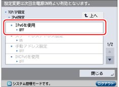 IPv6通信を使用しないときは、<IPv6を使用>の[OFF]を押します。