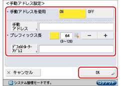 [IPv6設定]の[手動アドレス設定]を押す→次の項目を設定→[OK]を押す