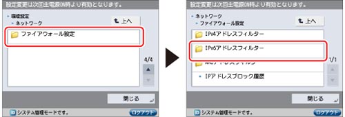 [IPv6アドレスフィルター]の[送信フィルター]または[受信フィルター]→<フィルターを使用>の[OFF]を押す