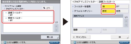 [IPv6アドレスフィルター]の[送信フィルター]または[受信フィルター]→<フィルターを使用>の[ON]→ <デフォルトポリシー>の[許可]を押す