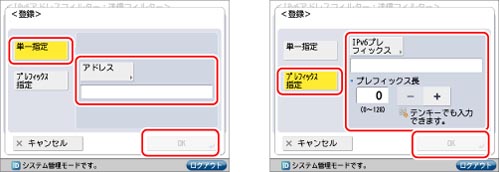 IPv6アドレスを単独設定する:[単一指定]→[アドレス]を押します。IPv6アドレスを入力したあと[OK]を押してください。