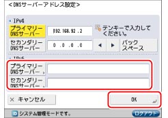 DNSの動的更新機能を使用する場合は、[プライマリーDNSサーバー]を押して、DNSサーバーのIPv6アドレスを入力したあと[OK]を押してください。
