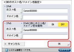 <IPv4と同じホスト名/ドメイン名を使用>を「OFF」:[ホスト名]を押して、本製品の名称を入力したあと[OK]を押してください。[ドメイン名]を押して、本製品が属するネットワークドメイン名を入力したあと[OK]を押してください。