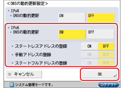 本体のIPv6アドレス、ホスト名、ドメイン名に設定した名前を、DNSの動的更新機能によって自動的にDNSサーバーに登録するときは、<DNSの動的更新>の[ON]を押します。DNSの動的更新機能には、ダイナミックDNSサーバーが必要です。