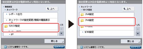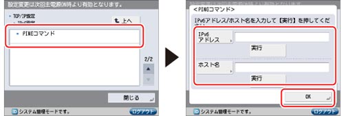 IPv6アドレスを検証する:[IPv6アドレス]を押して、ネットワーク上に存在する任意のIPv6アドレスを入力したあと[実行]を押します。タッチパネルディスプレーにPINGコマンドの実行結果が表示されたら、[OK]を押してください。
