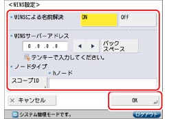WINSの名前解決を使用するときは、<WINSによる名前解決>の[ON]を押します。[WINSサーバーアドレス]にWINSサーバーのIPアドレスを入力してください。