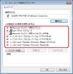 [ローカルエリア接続のプロパティ]ダイアログボックスで、[Microsoft ネットワーク用クライアント]、[インターネットプロトコル(TCP/IP)]/[インターネットプロトコルバージョン4(TCP/IPv4)]にチェックマークを付ける