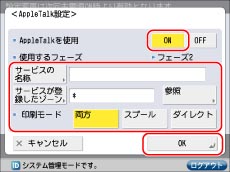 <AppleTalkを使用>の[ON]を押す→次の項目を設定→[OK]を押す
