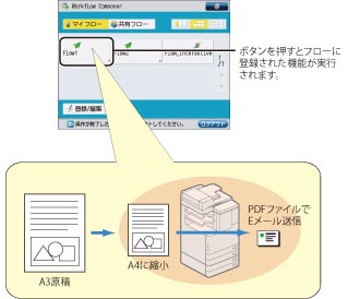 たとえば、A3サイズの原稿を読み込んで、A4サイズに縮小したPDFファイルでEメール送信する、といった一連の操作を一つの「フロー」ボタンを押すことで実行できます。