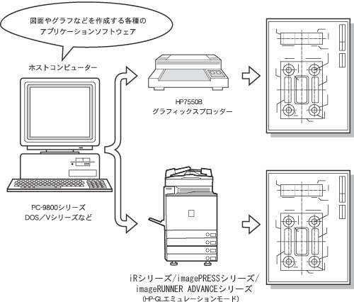 iRシリーズ/imagePRESSシリーズ/imageRUNNER ADVANCEシリーズの動作モードがHP-GLエミュレーションモードに切り替わることによって、HP-GL準拠のグラフィックス・プロッターを使って作図したときと同等の印刷を行うことができます。