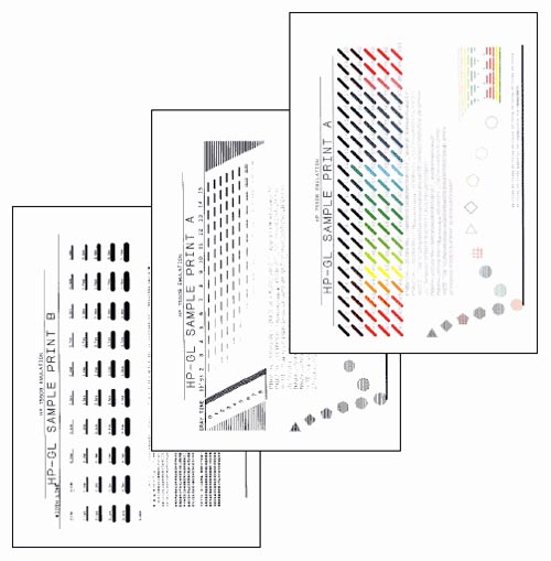 HP-GLエミュレーションモードのいろいろな機能を使用したサンプルデータの印刷を行えます。サンプルプリントでは、次の機能を確認できます。印刷前に、目的に合わせてそれぞれの機能をメニューで設定してください。