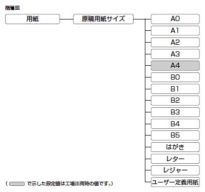 A0、A1、A2、A3、A4、B0、B1、B2、B3、B4、はがき、B5、レター、レジャー、ユーザー定義用紙