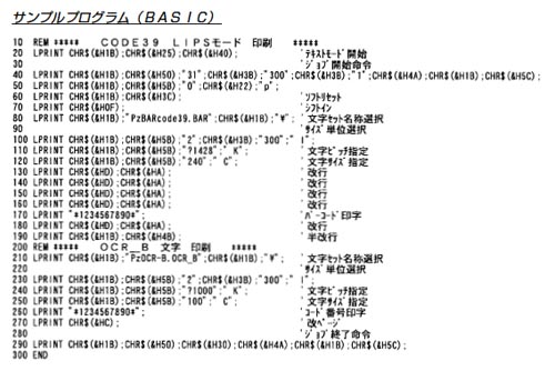 LIPSモードで、「*1234567890*」のCODE39のバーコードとOCR_B文字でコード番号を印刷する場合。(メインプログラムは「VC++用共通サンプルメインプログラム」を参照)