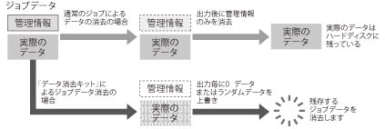 本体は、コピーや送受信、プリント出力時にジョブデータを管理情報領域と実データ領域に分けて保存します。管理情報はジョブ終了後、自動消去されますが、実データはメモリー領域内に残った状態になります。
