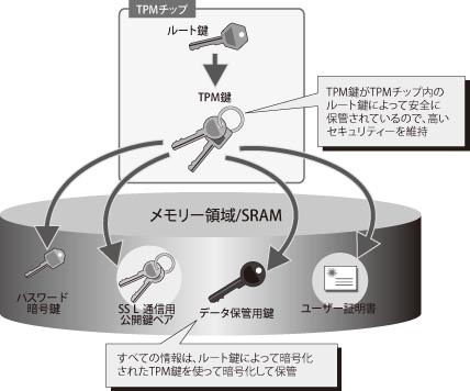 この機能を使用することで、メモリー領域内、およびSRAM内で管理しているパスワード情報や証明書情報を暗号化できます。