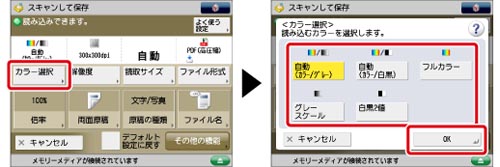 任意のカラーモ-ドをデフォルト設定として使用したいときは、デフォルト設定の変更で登録できます。(→スキャンして保存の設定をする)