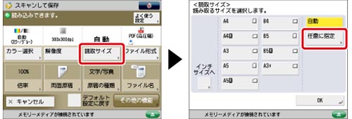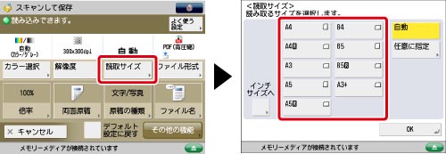 [自動]で読み取れない原稿を使用するときや、とくにサイズを指定する必要があるときに設定します。用紙いっぱいに画像があるA3サイズの原稿を端が欠けないように読み取ったり、指定したサイズを登録したりすることもできます。