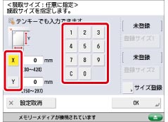 [X][Y]を押す→テンキーを使用して、mm単位で読み取りサイズを入力