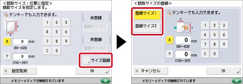 [サイズ登録]→[登録サイズ1]または[登録サイズ2]を押す