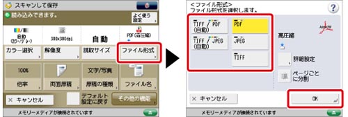 カラーモードが白黒2値のときはTIFF、フルカラーまたはグレースケールの画像を含むときはPDF形式で保存されます。読み込み画面では、「TIFF/PDF」と表示されます。