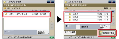 メモリーメディアを選択→保存先となる階層を選択→[原稿読込する]を押す