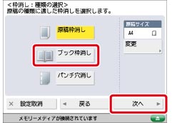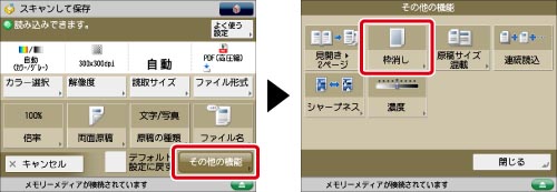 原稿を読み込んだときにできる周囲の影や枠線などを消して読み込みます。枠消しには、[原稿枠消し]、[ブック枠消し]、[パンチ穴消し]の3種類があります。