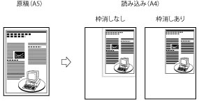 原稿が指定した用紙サイズより小さいとき、読み込んだ画像の周囲にできる影や枠線を消してファイルにします。読み込んだ画像の周囲に一定幅の余白(白地)を作って、読み込むこともできます。