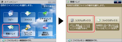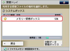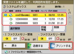 メモリー受信ボックス内のファクス/Iファクス受信ファイルは、それぞれ<ファクスメモリー受信>または<Iファクスメモリー受信>を「OFF」に設定するとプリントされ、メモリーから削除されます。
