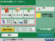 [ファンクション設定](設定/登録)の[新規宛先の制限]で「ON」に設定されている宛先種別は、新規で宛先を入力できません。すでに登録されている宛先をローカルアドレス帳、リモートアドレス帳、LDAPサーバーから検索、または、ワンタッチから選択してください。(→送信機能の制限)