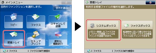 暗証番号を求められた場合は、[ファンクション設定](設定/登録)の[受信トレイ設定]の[システムボックス暗証番号]で登録した番号を入力してください。(→受信トレイを設定する)