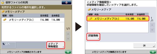 [メディア情報確認]を押す→目的のメモリーメディアを選択→[詳細情報]を押す