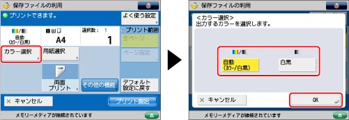 白黒プリントを連続して実行したあと、カラープリントを実行すると、タッチパネルディスプレーにカラープリントが準備中であることを示すメッセージが表示されることがあります。メッセージが消えるまでお待ちください。メッセージが消えたらカラープリントが始まります。