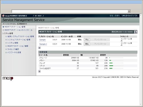 本体にインストールされているアプリケーションの状況などが表示されます。