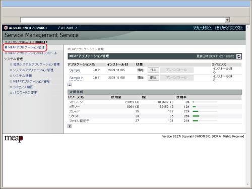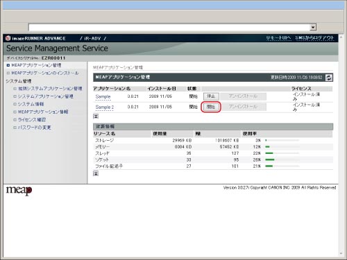 アプリケーションをインストール後、一度も開始したことがない状態、またはアプリケーションを停止したあと本体の主電源を切り、再起動したあとに一度も開始されていない状態