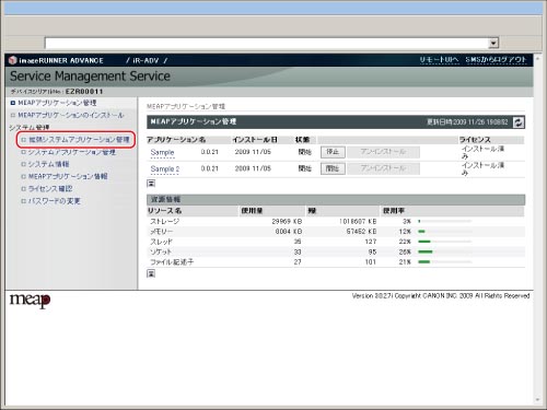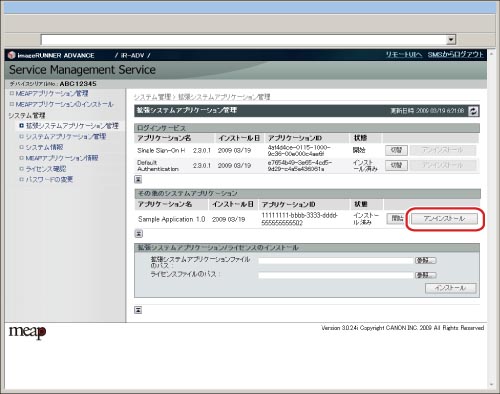 Default Authentication(部門別ID 管理)と、使用中のログインサービス(状態が「再起動後停止」と表示されているログインサービス)、次回本体を起動したときから使用するログインサービス(状態が「再起動後開始」と表示されているログインサービス)は、アンインストールできません。