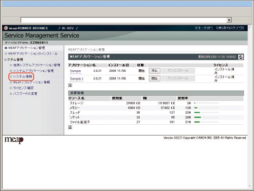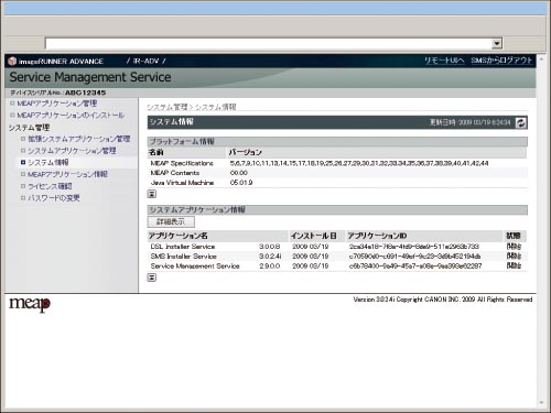 Java Virtual Machineなどのプラットフォームに関するバージョン情報や、システムアプリケーションのバージョン情報、インストール日、状態などを確認できます。