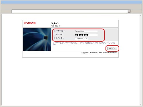 ローカルデバイス認証の一般ユーザーのユーザー名、パスワードを入力→ログイン先に[このデバイス]を選択→[ログイン]をクリック