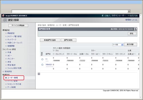 リモートUIから行うことができる部門別ID管理は、本体操作パネルの[ユーザー管理](設定/登録)→[部門別ID管理]からも行うことができます。部門別ID管理の詳しい説明は、「部門別ID管理について」を参照してください。