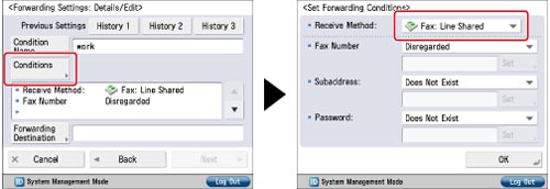 Press [Conditions] → press the <Receive Method> drop-down list → select [Fax: Line Shared].