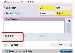Press [On] for <Use Filter> → press [Reject] for <Default Policy> → press [Register].