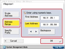 Press [Address Range] → press [First Address] and enter '192.31.255.1' → press [Last Address] and enter '192.31.255.254' → press [OK].
