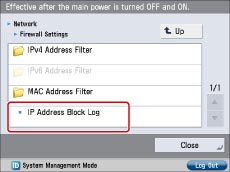 You can check the log of send transmission from this machine to the machine with the authorized IP address and the access log by the machine with the authorized IP address. The log can store up to 100 transmissions. Follow the procedures below to check the log.