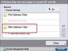MAC Address is a unique ID number for network machine. The address does not change even if the IP address is changed. In addition to the IP address, you can set the Send Filter as well as the Receive Filter for the MAC Address. Follow the procedures below to set the filter for the MAC Address.