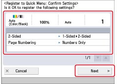 This section describes the procedure for registering the settings for copying a one-sided document to both sides of the paper and adding page numbers, and exporting those settings to import them into another machine.