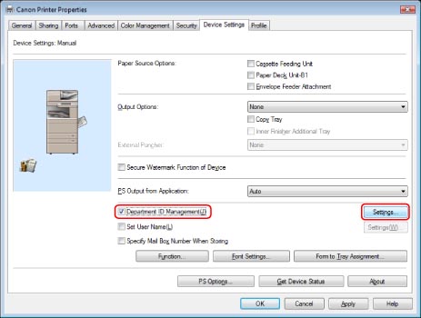 If you select [Confirm Department ID/PIN When Printing], the information stored in the device is authenticated each time you print.