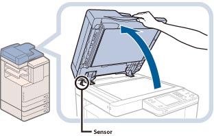 This machine is equipped with an open/close sensor on the feeder/platen cover (see circled area in the above illustration). When placing originals on the platen glass, lift the feeder/platen cover approximately 11 7/8" (300 mm) so that the sensor detaches from the feeder/platen cover. If the sensor does not detach from the feeder/platen cover, the size of the originals may not be detected correctly.