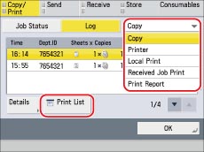 Press the drop-down list → select the type of job to print → press [Print List].